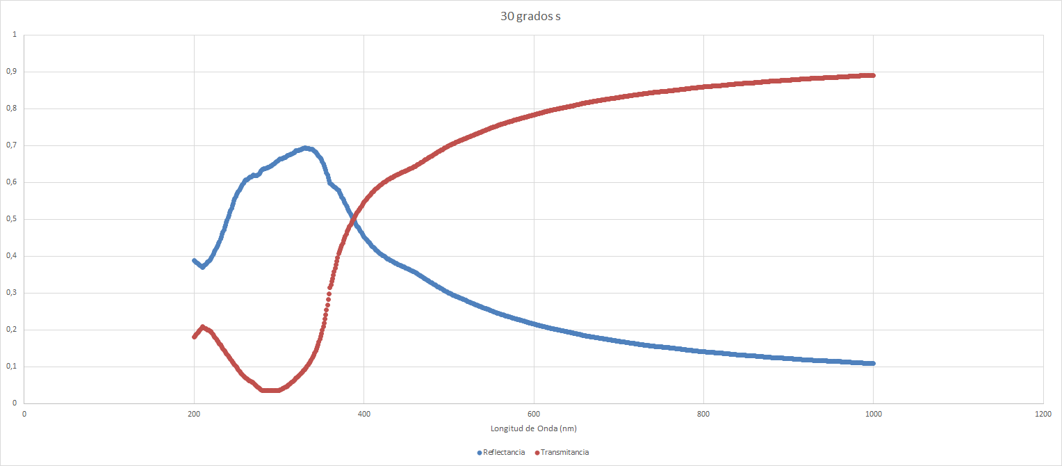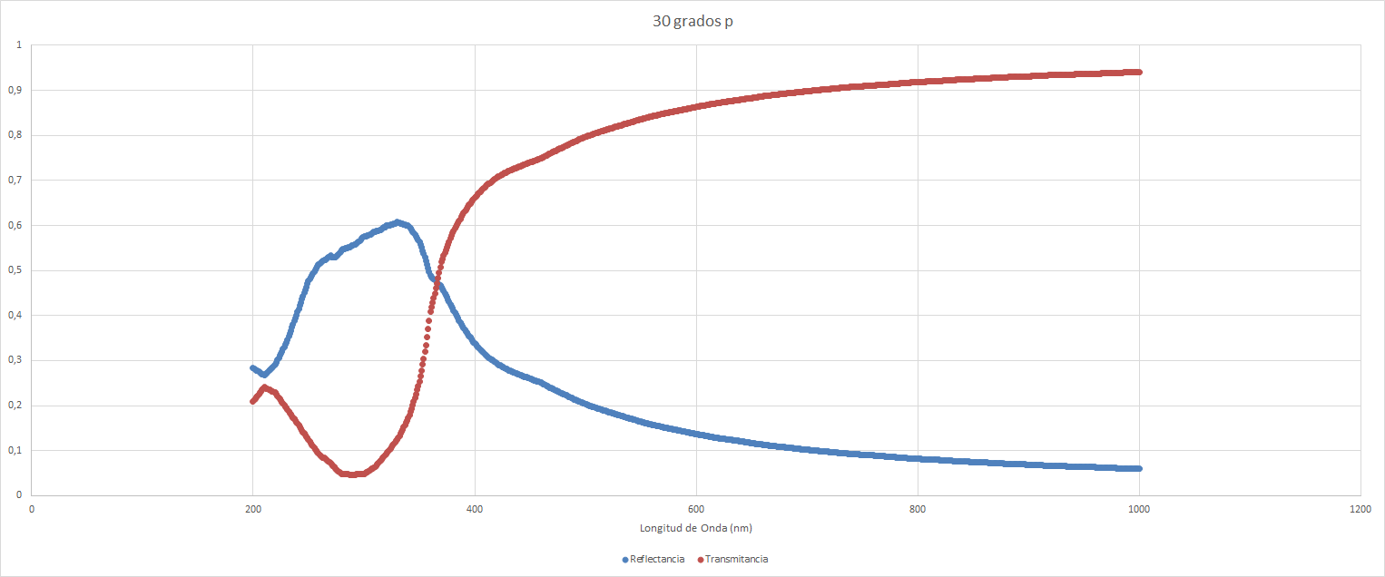 Todos estos datos se han obtenido mediante una polarización de tipo s. Tenemos también los datos equivalntes para la polarización de tipo p. Considerando que con incidencia nula no varían los datos, para un ángulo de $30 \degree$, tenemos: