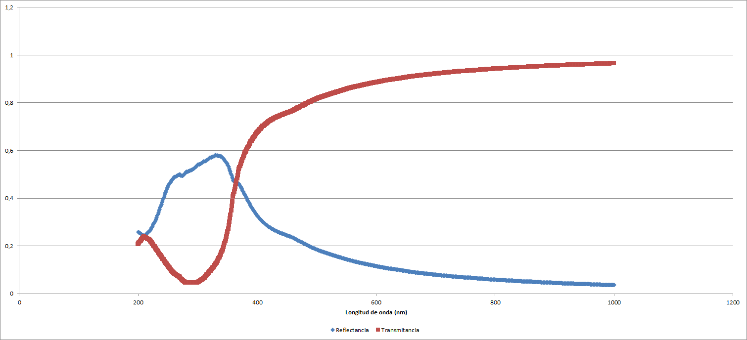 Hemos podido comprobar como el material tiene transmitancias altas conforme aumentamos la longitud de onda, lo cual es útil para el cometido principal de uso del mismo, siendo estimulado habitualmente por luz ultravioleta, de $\lambda$ corta. Conseguimos así que la luz no pase fácilmente la película.