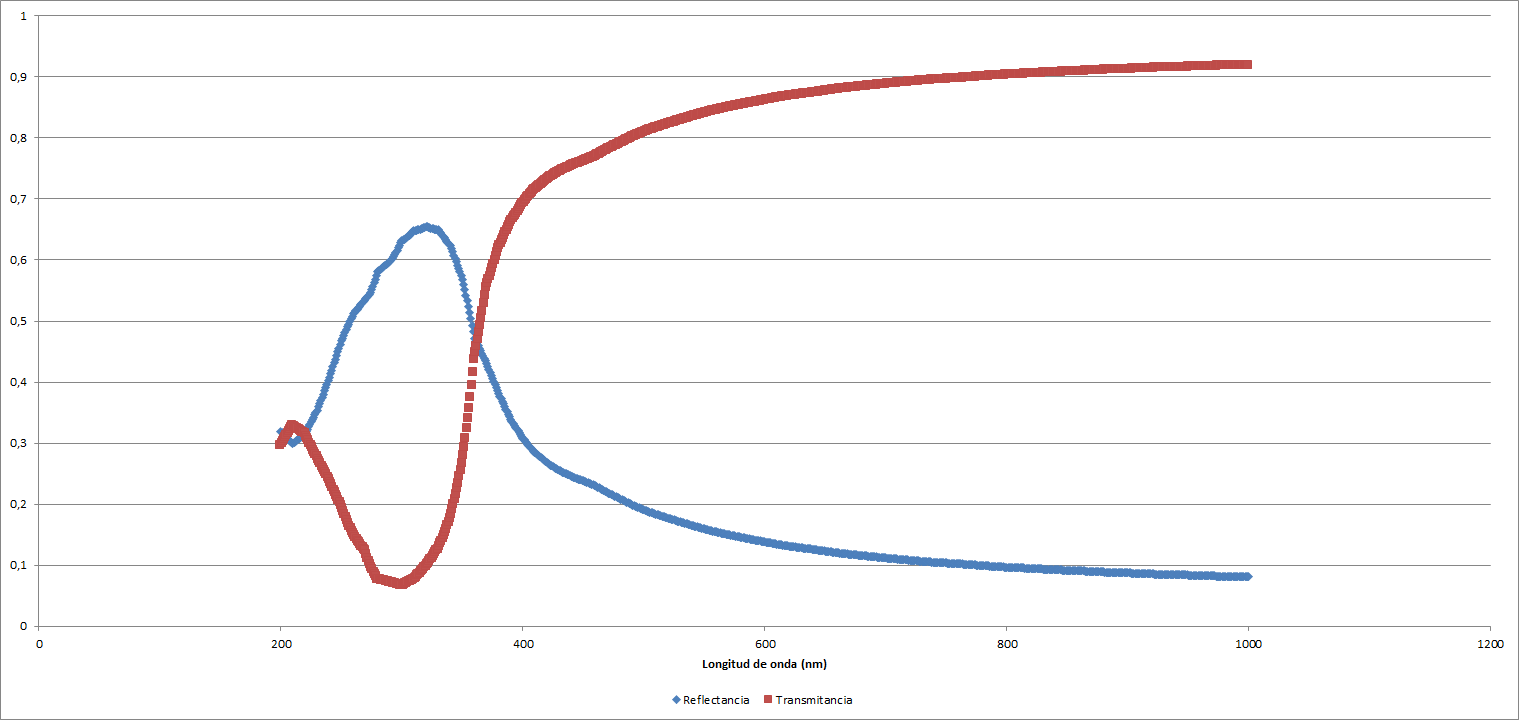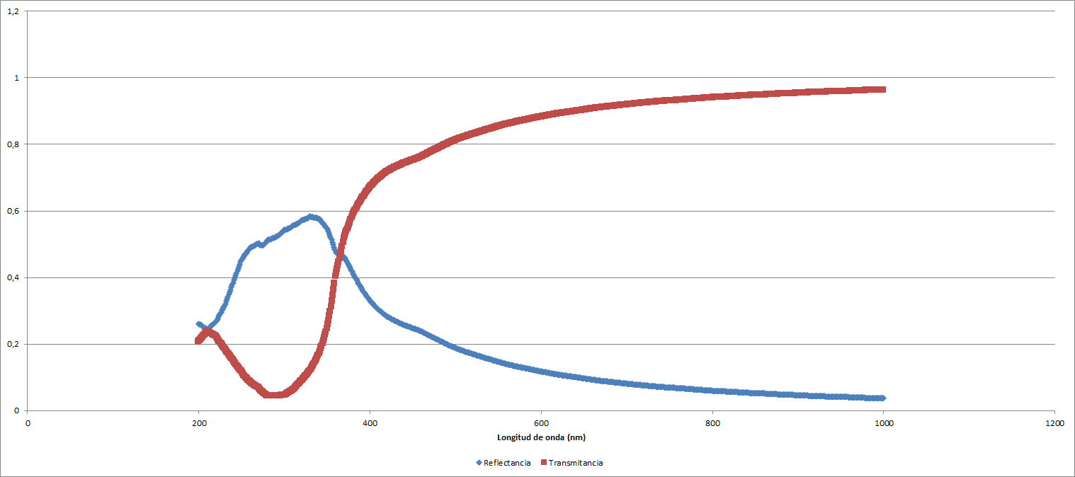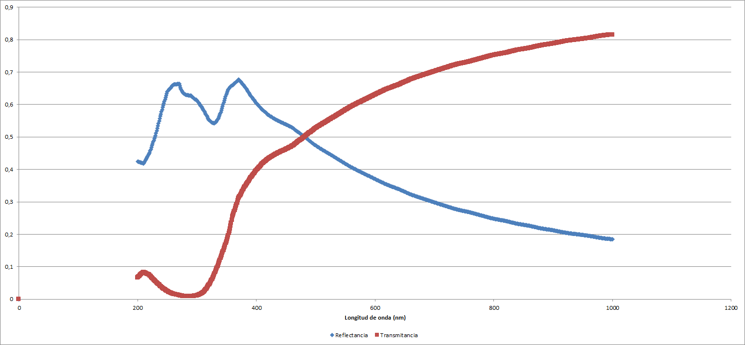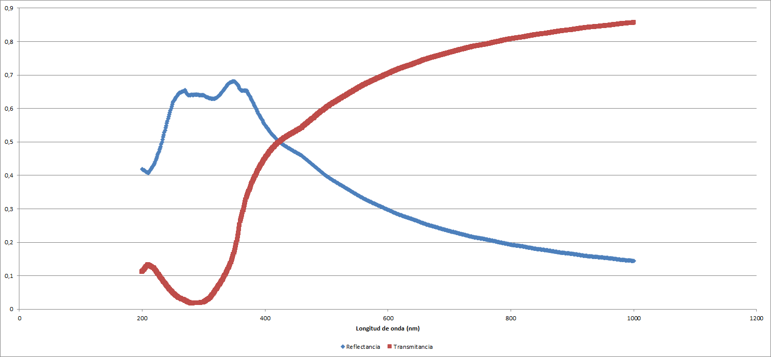 Entre un medio acrílico y uno de celulosa, los datos son prácticamente idénticos. Sin embargo, al compararlo con nuestra lámina de TiO2 y Rutilo vemos que los dos medios son significativamente mejores transmisores de la luz que incide sobre ellos.