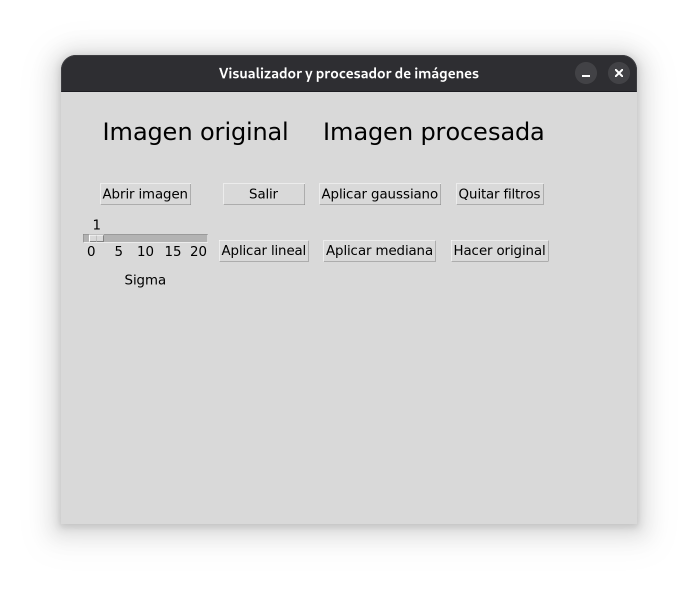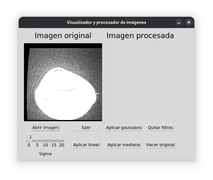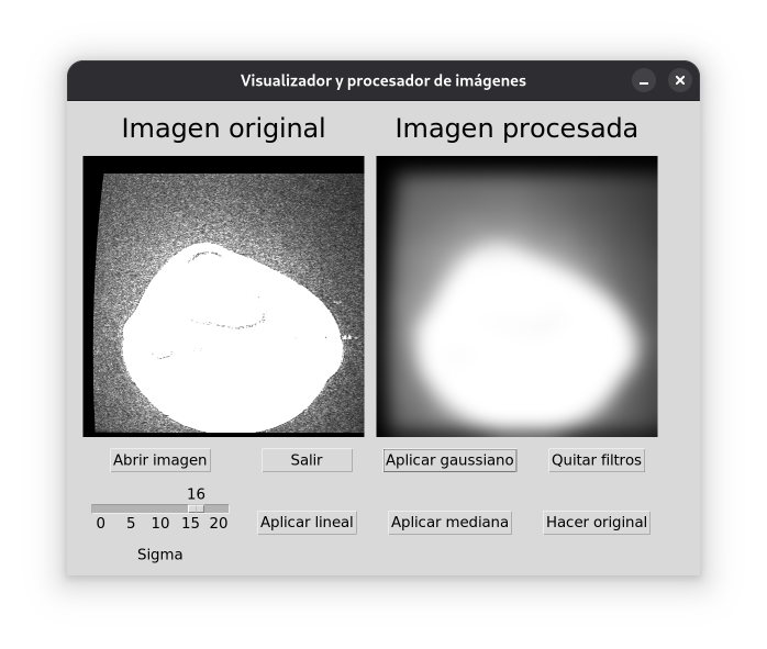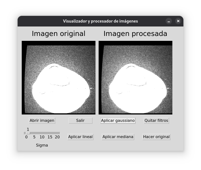 cargarDicom(), encargado de mostrar un diálogo para abrir un archivo, comprobando su correcta apertura. Se genera una matriz de píxeles y una imagen manipulable. Por último, se genera una fotografía para actualizar el label correspondiente a la imagen, almacenado en labelOriginal.copiaOriginal(), que permite que la imagen original (sea procesada o no) pase a ser la procesada. A nivel práctico, elimina todos los filtros puestos después de introducir una imagen como original.hacerOriginal(), que permite aplicar filtros sobre una imagen procesada, convirtiéndola en original. Una vez hecha una imagen original, no es posible recuperar la anterior.filtro*():filtroGaussiano(). Toma un argumento, cant, que se introduce con una escala. Este argumento permite definir la intensidad del filtro Gaussiano que realiza la función, para saber cuántas filas tendrá la matriz cuadrada de filtrado de la imagen.filtroLineal(). Función idéntica a la descrita con anterioridad, con la excepción de que el filtro no pondera los píxeles entorno al centro.filtroMediana(), que realiza un filtro de mediana, especificando con el parámetro el número de elementos de la distribución. Nótese la necesidad de especificar un parámetro impar. Si no ocurre esto, se muestra un error, instando al cambio.Estos filtros han podido hacerse gracias a la clase ImageFilter que incorpora la librería Pillow. Dentro de esta clase se encuentran distintos métodos para filtrar imágenes.